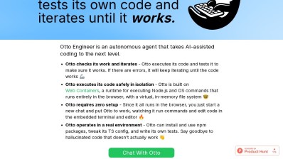 Otto Engineer is an AI-driven coding assistant designed to independently write, test, and iterate code within a browser-based setting, removing the need for setup. It harnesses Web Containers to securely run Node.js and OS commands in isolation, guaranteeing that code functions in a genuine context, not a simulated one. Otto is capable of managing npm package installations, configuring TypeScript, and creating its own tests, making it a valuable asset for developers aiming to accelerate the coding and debugging process, boost productivity, and verify code functionality before deployment. Users may find Otto appealing for its capability to swiftly develop and refine code without the burden of manual testing and environment configuration.