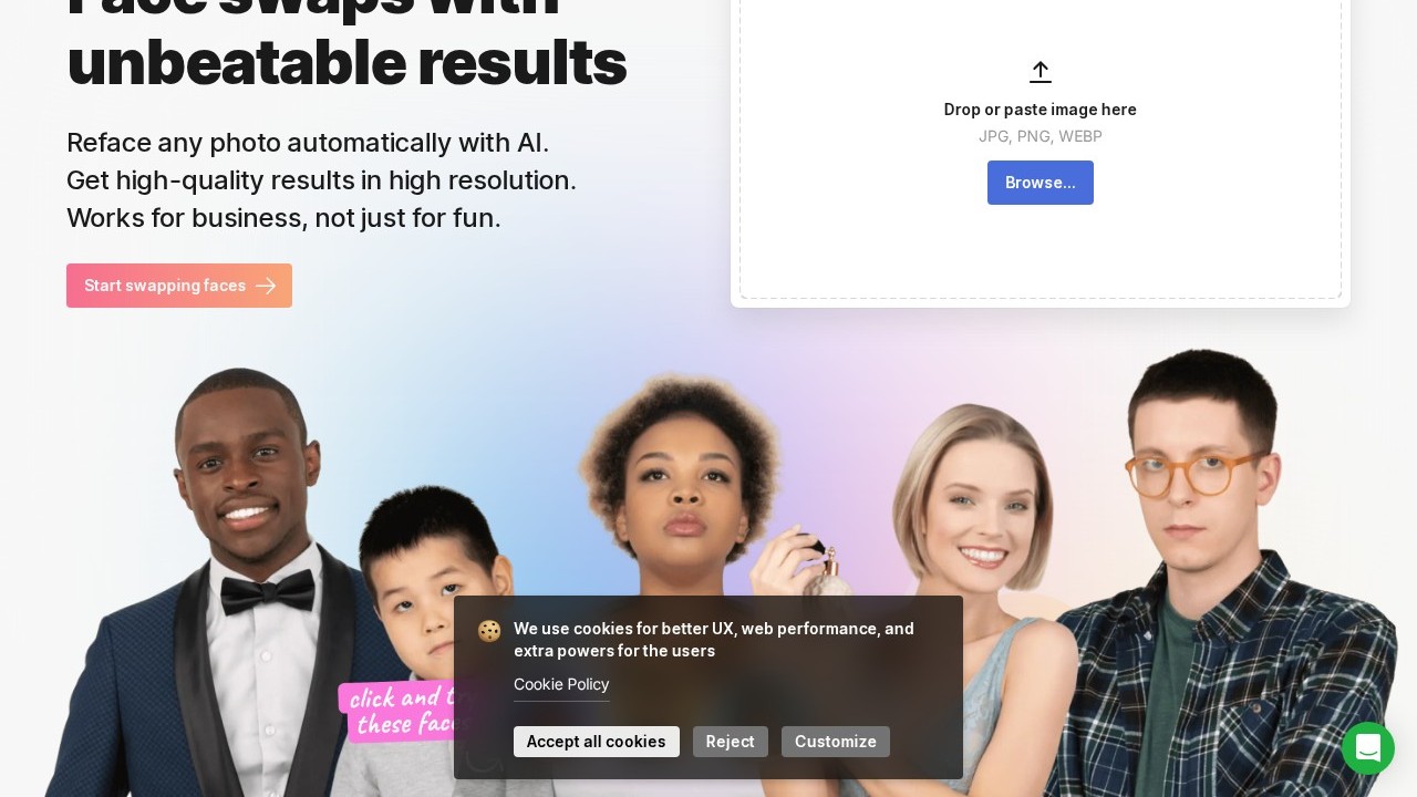 Face Swapper is an AI-driven application enabling users to perform high-quality face swaps. Utilizing artificial intelligence, it identifies faces in images and replaces them with others chosen by the user. The tool supports images up to 5 MB with facial dimensions of up to 1024*1024 pixels and produces results that maintain the original image's size and quality. It also includes a multiswap feature for replacing multiple faces in one image simultaneously, along with a Smart Upscaler that employs AI to improve image resolution.