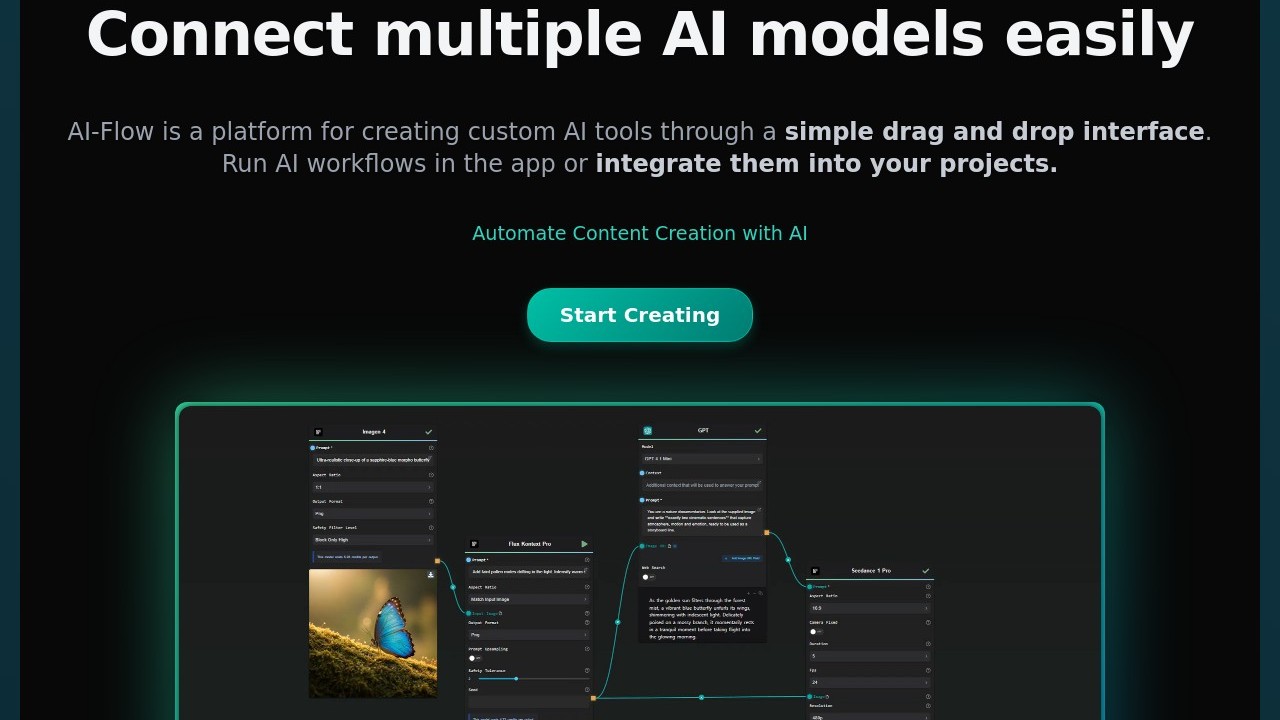 AI-Flow is a free, open-source application that offers a user-friendly interface for linking multiple AI models into interactive networks. By employing prompt engineering, it facilitates the development of multi-perspective responses to diverse prompts. AI-Flow can integrate data from different sources and create images using DALL-E or Stable Diffusion. It ensures security by storing all data locally on the user's device. AI-Flow can be operated locally, with executables available in the release section of its GitHub repository.