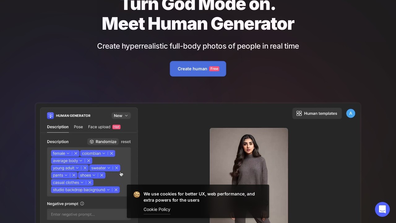 Human Generator, developed by Generated Media, Inc., is a tool that enables users to create hyper-realistic, full-body images of individuals instantly. The tool employs a GAN (generative adversarial network) and is trained using studio photographs provided by Icons8.