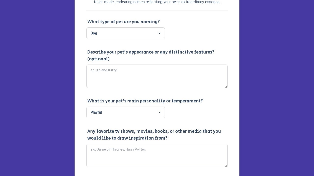 The AI Named My Pet tool serves as an AI assistant that crafts personalized names for pets, taking their individual traits and characteristics into account. Users can specify the kind of pet they wish to name, describe its looks or unique traits, outline its primary personality or behavior, mention any favored media for inspiration, and choose a desired name origin. Subsequently, the tool produces names that are crafted by Gary Meehan and generated by AI.