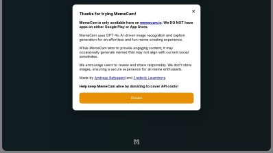 MemeCam is a platform that integrates BLIP image recognition with GPT-3.5-powered caption generation to produce memes. It ensures a secure experience by not storing images and advises users to review and share with caution. Users can create up to five memes per hour, and donations are welcomed to support API expenses and maintain the website.