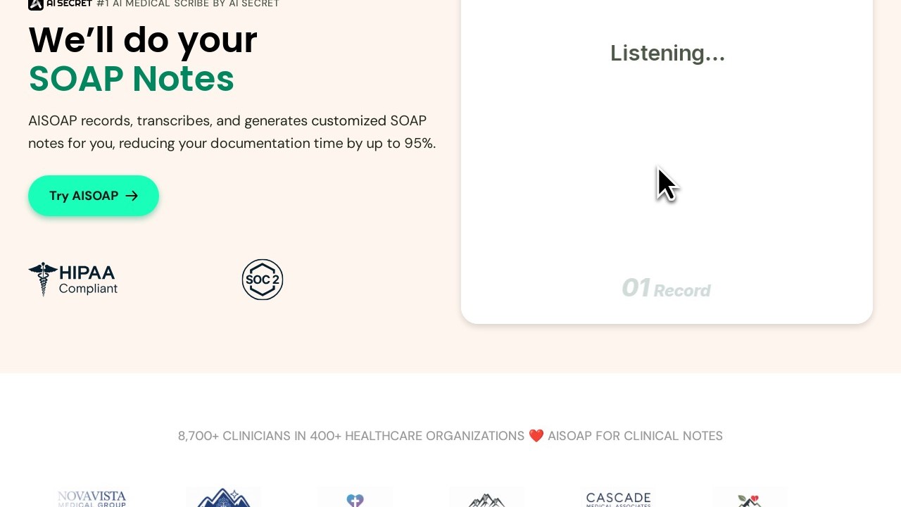 AISOAP is an AI-driven medical scribing tool that transforms patient discussions into organized SOAP notes. It captures and transcribes consultations, cutting down documentation time by up to 95%, supports more than 50 medical specializations, and integrates with EHR/EMR systems. Healthcare providers may utilize AISOAP to conserve time, enhance patient care, ensure precise documentation, and optimize their workflow. By automating the note-taking process, AISOAP enables medical professionals to concentrate more on patient interactions while preserving high-quality, customizable medical records.
