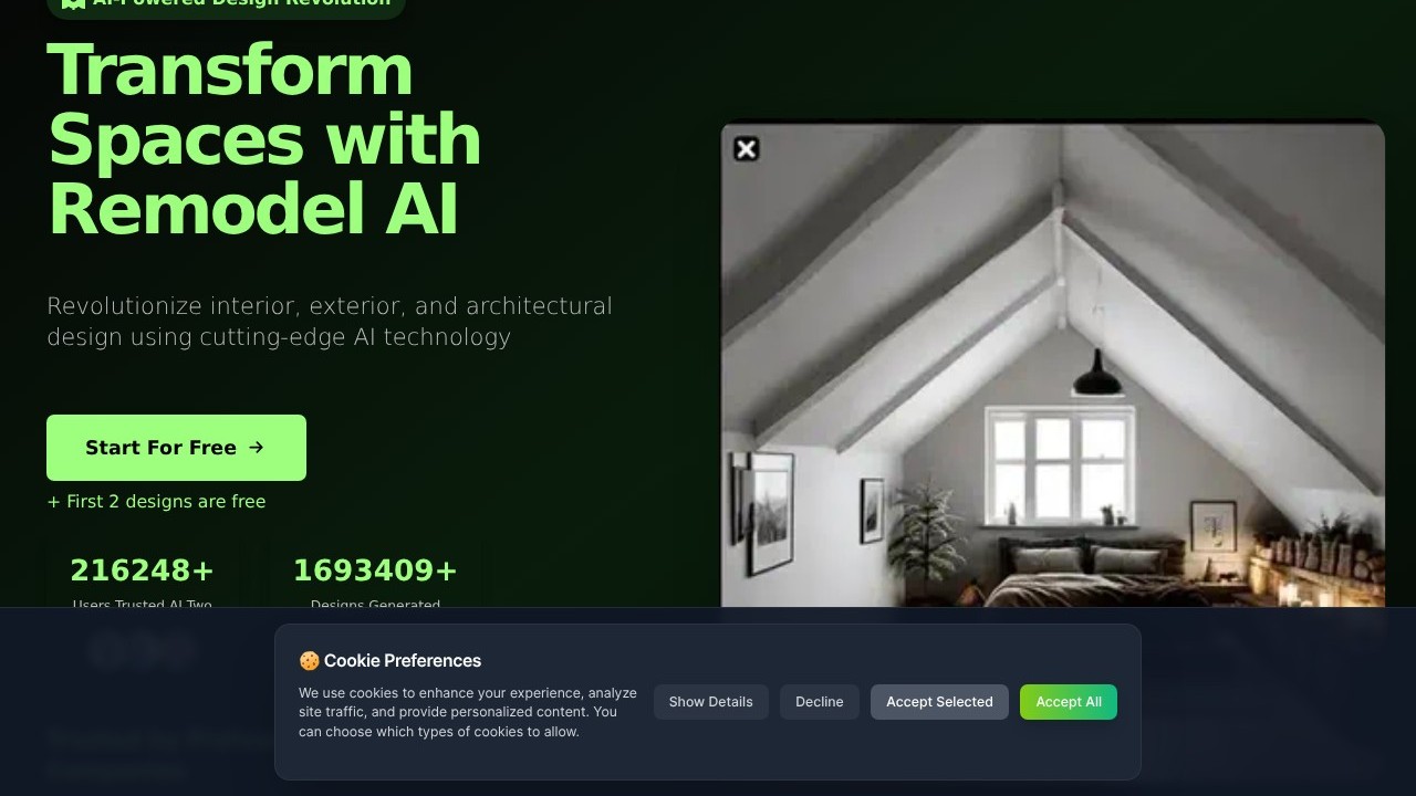 An AI-driven design application that enables users to create interior designs for spaces like bedrooms, living rooms, kitchens, bathrooms, and dining areas. It can also be utilized for exterior designs of houses and buildings. Users have the option to choose from a wide range of styles, such as tropical, modern, traditional, rustic, mid-century, minimalist, eclectic, gaming, glamorous, industrial, coastal, bohemian, farmhouse, art deco, Mediterranean, Asian, French country, English cottage, Moroccan, Scandinavian, Hollywood Regency, among others. Additionally, users can select the level of transformation they wish to see in the interior image, along with optional decorations and furniture. The tool includes a Sketch2Real feature that transforms sketches into realistic visuals.