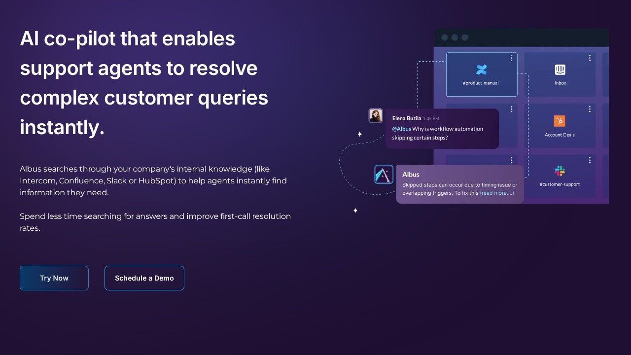 Albus is an AI-driven assistant integrated with Slack, designed to enhance team productivity. It assists in crafting personalized and captivating content, brainstorming design concepts and business strategies, analyzing market trends, compiling reports and presentations, responding to customer questions, and developing marketing materials.