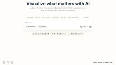 MyLens AI converts any input into clear visuals, serving a wide range of professionals such as marketers, educators, business analysts, and healthcare experts. It aids in the visualization and planning of projects, strategies, and educational resources by producing detailed visuals for various topics and requirements. Users have the ability to create content calendars, strategic frameworks, research stages, wellness strategies, and more. Additionally, MyLens AI supports competitive positioning, performance evaluations, market introduction strategies, and financial evaluations, making it an essential asset for streamlining processes, improving presentations, and reaching strategic objectives across multiple domains.