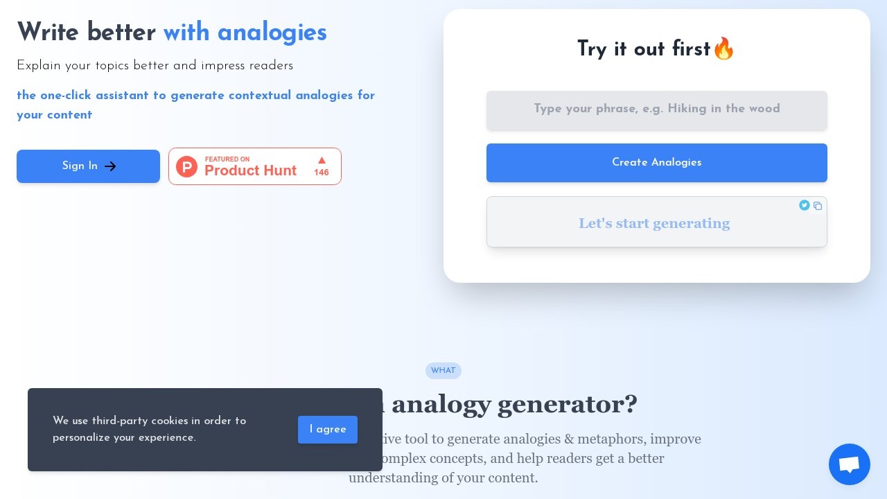 Analogenie is a tool designed to assist users in crafting creative analogies and metaphors to capture and connect with their audience. With just a click, it swiftly generates analogies, enabling users to produce content that is both clear and detailed. This tool is suitable for all kinds of writing, such as creative, business, academic, copywriting, and beyond. It provides a flexible pricing structure and is available at no cost.