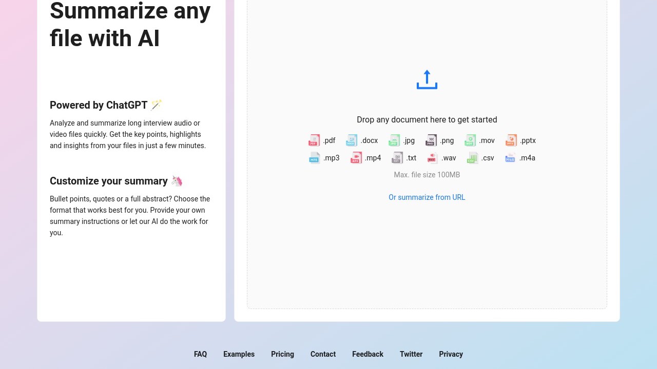 AnySummary is an AI-driven tool designed to quickly condense lengthy interview audio or video content. It provides a customizable summary format, including options like bullet points, quotes, or a comprehensive abstract, and is capable of generating summaries from both files and URLs. The tool is compatible with a variety of file types, such as images, audio, video, text, and CSV files. Additionally, AnySummary offers useful FAQs, examples, and customer reviews.