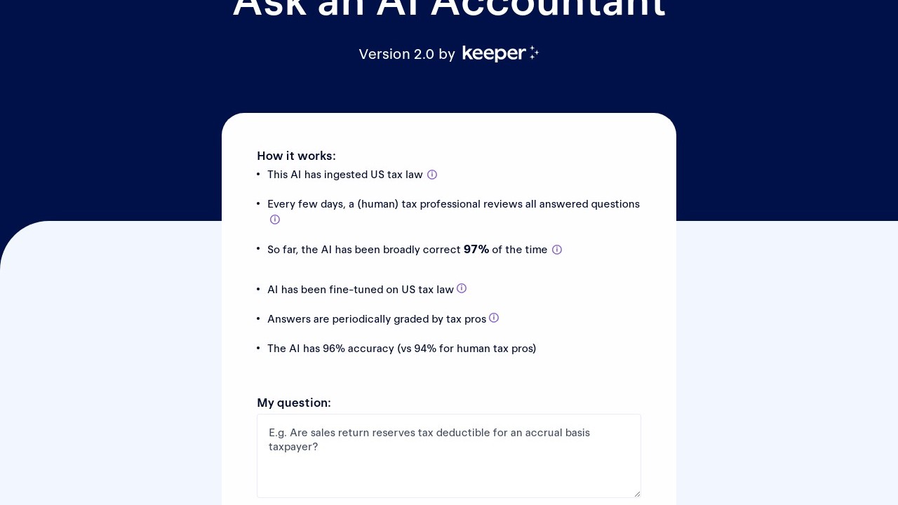 The Ask an AI Accountant tool is a complimentary AI accountant designed to assist individuals with their tax inquiries by applying the most recent US tax legislation. A human tax expert examines the AI-generated responses to verify their precision. Users are welcome to submit questions in any language, and the fact-checked answers are available on the website. The tool also provides free tax resources, such as calculators for estimating tax liabilities and identifying tax deductions. Keeper Tax, the company responsible for this tool, offers a tax filing app tailored for freelancers to uncover tax deductions and file taxes efficiently.