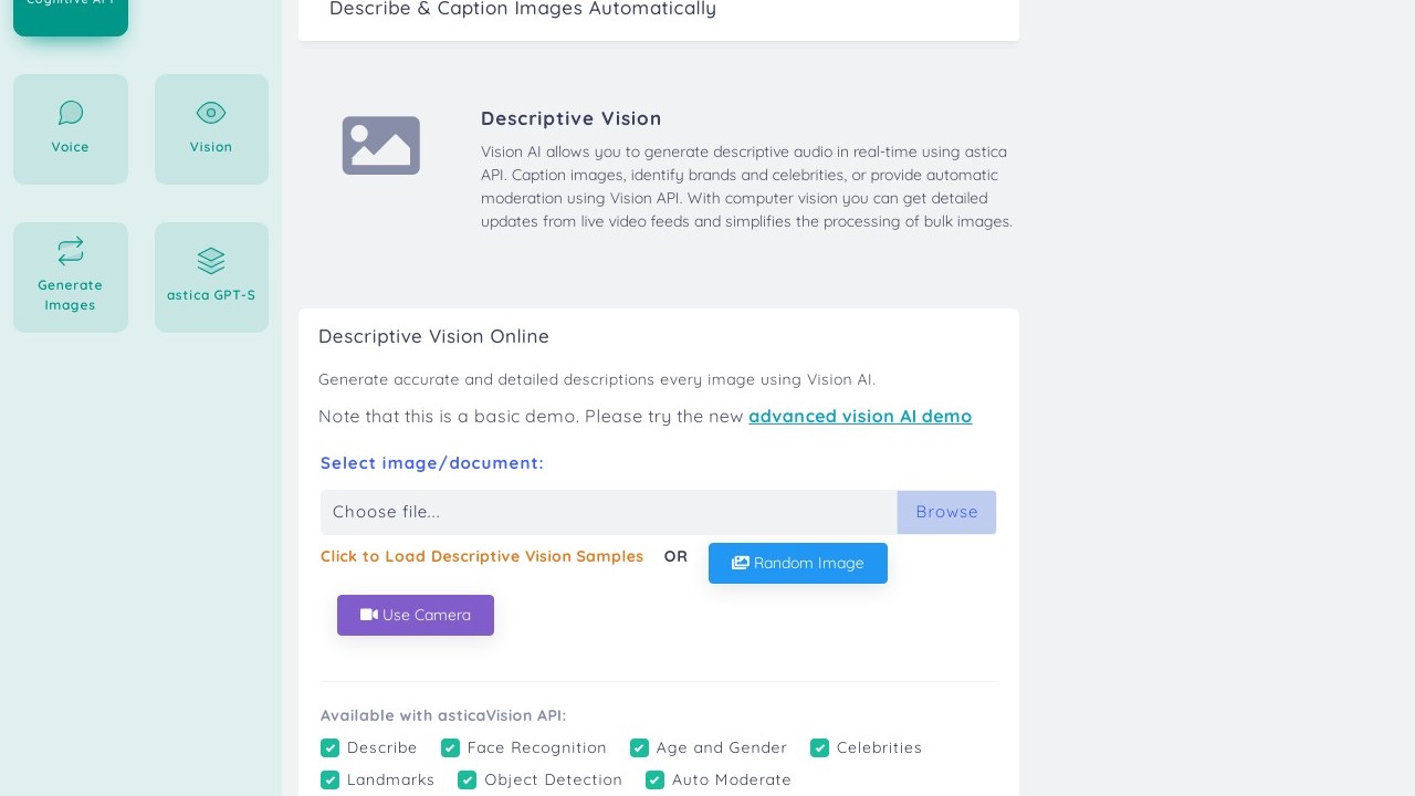 The Astica tool is a demonstration of astica.ai’s cognitive API, featuring voice and vision AI functions. It assists in reading, describing, categorizing, and moderating images and documents; creating assistants; transcribing audio files; and producing descriptive audio instantly. Additionally, it can deliver precise and comprehensive image descriptions, identify faces and objects, and oversee uploaded images. It offers a simple integration with robust computer vision to depict images, recognize faces and objects, and manage uploaded images.