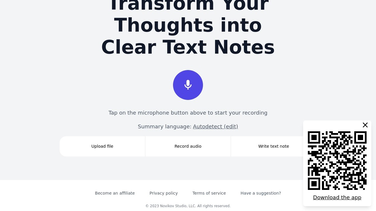 AudioNotes.ai is an application designed for taking notes, utilizing AI to convert audio recordings into precise written notes. Users can personalize their experience by modifying app settings to suit their needs, such as choosing the input and output language, summary style, and length. Additionally, the tool offers an affiliate program and provides access to its privacy policy and terms of service.