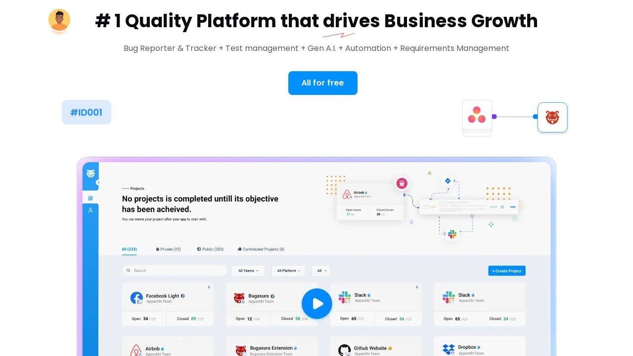 Bugasura is a contemporary bug tracking software tailored for today's teams. Its AI-enhanced bug tracking capabilities allow users to report, monitor, and resolve bugs more efficiently. Bugasura helps optimize bug tracking processes, offering a modern and collaborative user interface along with seamless integrations with platforms like JIRA, GitHub, Slack, and others. The primary goal of the tool is to boost productivity, minimize technical debt, and save time and resources for teams. It caters to rapidly evolving tech teams and includes features like visual bug reporting, adaptable workflows, and easy-to-use integrations.