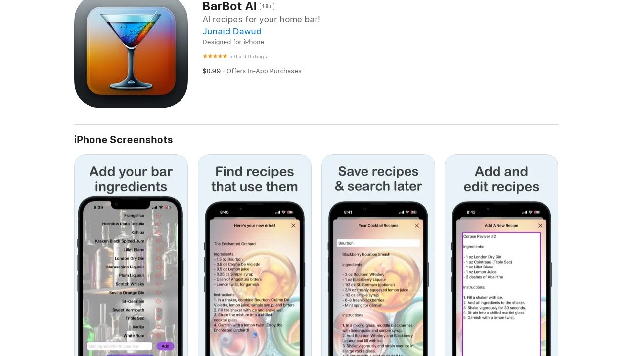 BarBot AI is an app driven by artificial intelligence that recommends cocktails based on your bar ingredients. Experience the capabilities of AI in your own home bar! Simply input your bar ingredients, and your AI bartender will suggest cocktails you can prepare! Keep recipes saved for future use.