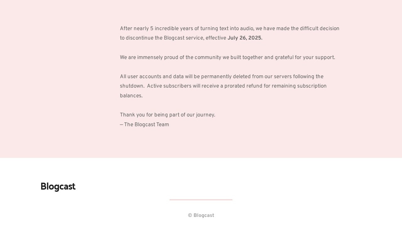 BlogcastTM is an AI-driven text-to-speech application enabling users to produce podcasts, videos, audio for eLearning modules, and audiobooks without the need for recording. It features a range of voices and languages, along with hosting services, podcast feeds, media players, WordPress plugins, and RSS feed synchronization.