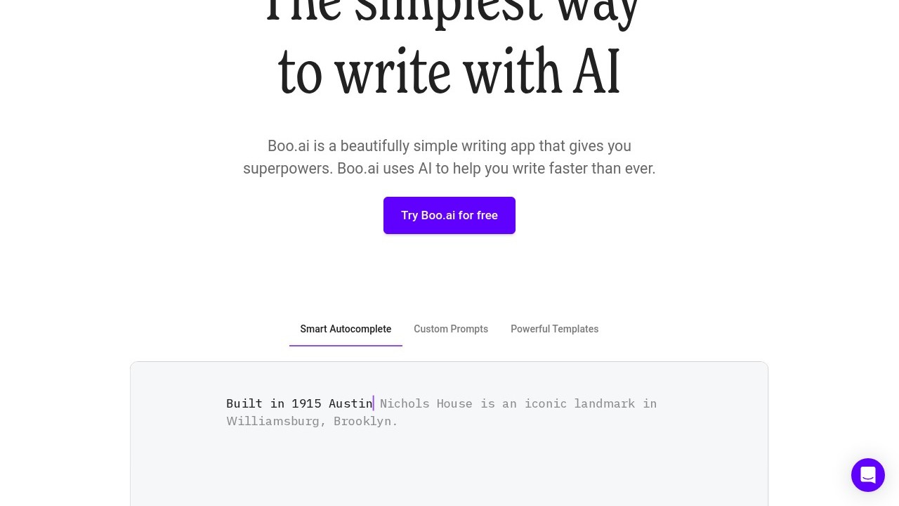 Boo is an AI-driven writing tool designed to enhance your writing speed and efficiency. Utilizing GPT-3, it generates text, offers ideas, and provides prompts, all within a user-friendly text editor. It includes Markdown support to maintain your writing momentum. The introductory plan is priced at $7.99 per month, featuring a one-week free trial and a perpetual 30% discount on any future paid subscriptions.