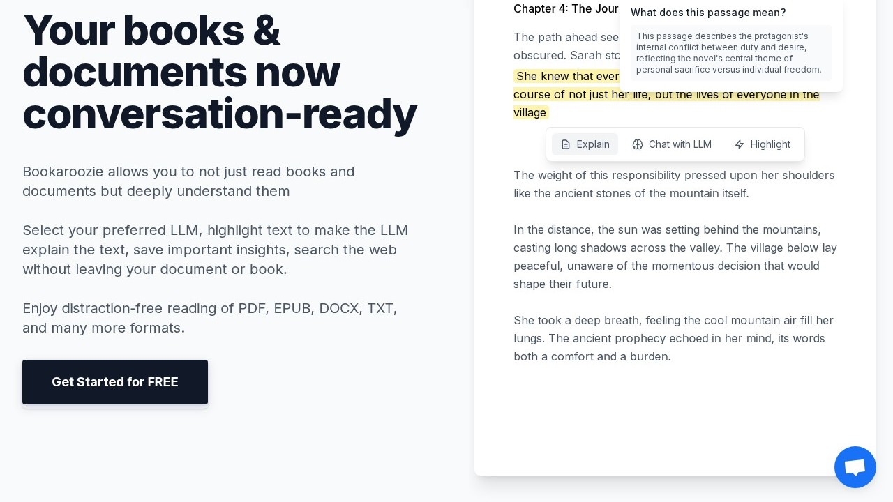 Bookaroozie is an AI-driven reading assistant that aids users in gaining a comprehensive understanding of books through content interaction. It allows readers to highlight sections in formats such as PDF, EPUB, TXT, and DOC to pose questions and get explanations from their selected large language model. The platform also facilitates saving important insights, web searching within the book, and engaging in real-time discussions about the content. Its design is free from distractions, offers customizable AI model options, and includes note-taking capabilities, transforming reading into an interactive educational journey.