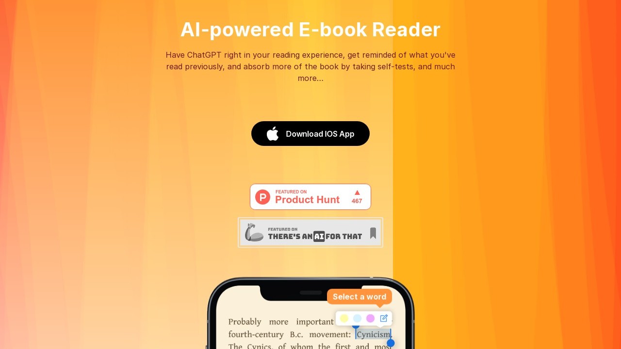 BookRead is an AI-driven e-reader application that elevates the reading experience by incorporating ChatGPT for interactive text interaction, delivering advanced analytics to monitor reading progress, supplying self-assessments and summaries for improved content retention, and offering access to thousands of free books. It is tailored for readers, students, and professionals aiming to enhance their comprehension, efficiency, and engagement with written content, making it an excellent resource for individuals seeking a more interactive and insightful reading journey.