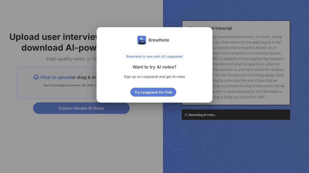BrewNote is an AI-driven application designed to simplify the task of extracting notes from user interviews. It enables users to upload their interview recordings and receive high-quality, AI-generated notes within just 10 minutes. The tool safeguards privacy by ensuring that no other individuals have access to the recordings. It is tailored for English-language calls that are under one hour long and involve two or more participants. Supported formats for audio and video include mov, mp4, mp3, m4a, wav, and aac. Users can also review sample AI-generated notes to better understand the tool's functionality.