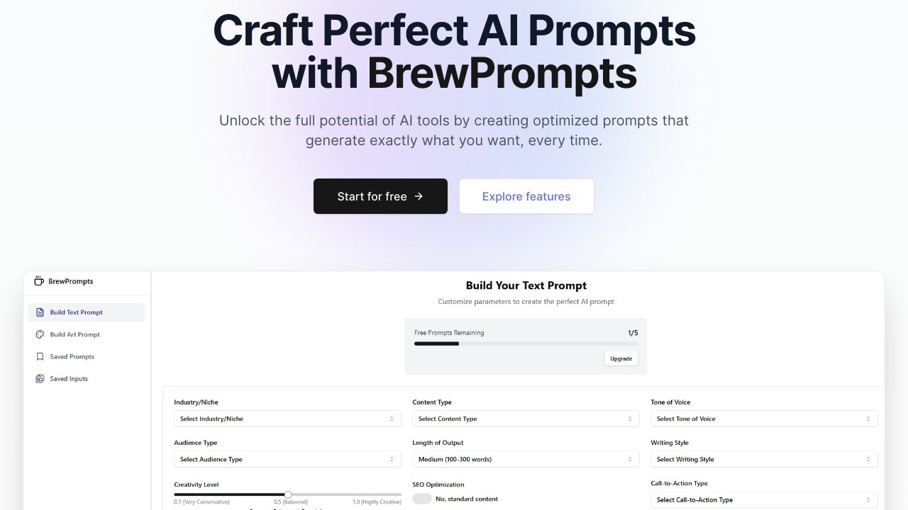 BrewPrompts is a utility designed to enhance AI prompts, helping users generate more accurate and dependable AI results. It includes features such as a text prompt builder, an art prompt generator, and the capability to save prompts for quick access. The platform offers both free and Pro plans, with the Pro plan offering more advanced tools and additional advantages. Reviews indicate the tool is particularly effective for designers and marketers, saving time and boosting outcomes.