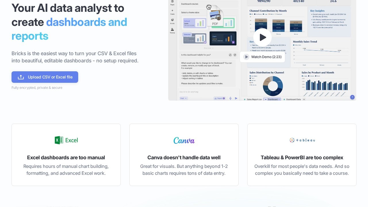 Bricks is an AI-driven spreadsheet application that streamlines the creation of reports, presentations, charts, and visuals by enabling users to produce these components directly from their spreadsheet data. By simply describing what they wish to create, users can have Bricks construct it swiftly, making it a perfect solution for those seeking to enhance their data analysis and reporting efficiency without requiring extensive knowledge of spreadsheet operations. It is beneficial for individuals looking to save time, improve the aesthetics of their data presentations, and utilize ready-made templates and blocks for diverse business areas such as sales, marketing, and operations.