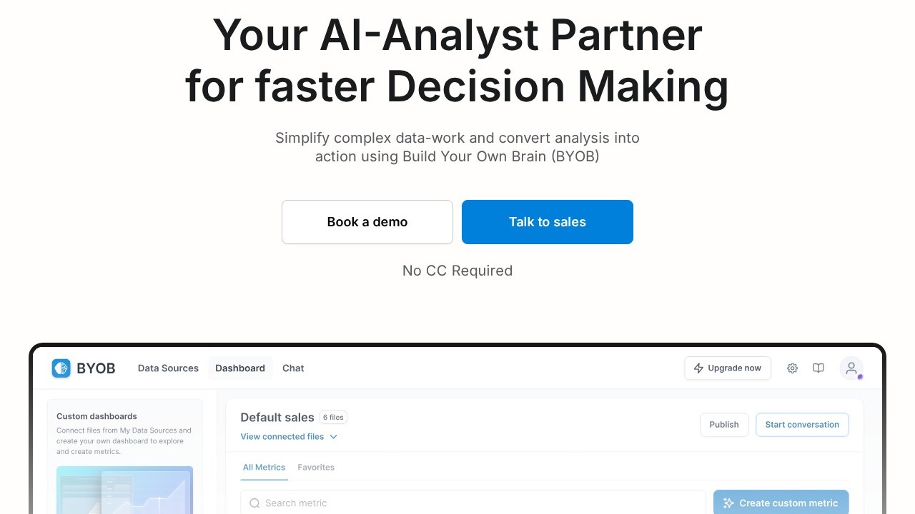 The BYOB tool is an AI-powered assistant designed to support various data and decision-making requirements. It connects to numerous data sources, systematically organizes the information, and creates a knowledge repository. The tool is capable of self-training to increase its contextual understanding, providing analytics and real-time actionable insights. Furthermore, it seamlessly integrates with existing workflows and tools. It is applicable in various areas such as product analysis, customer sentiment evaluation, predictive product demand forecasting, financial data examination, lead scoring and qualification, market trend analysis and competitor intelligence, as well as automated budgeting and forecasting, audience segmentation and targeting, and more.