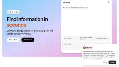 Needle is an all-encompassing AI framework tailored for businesses aiming to seamlessly incorporate AI-driven workflows into their processes with security and efficiency in mind. Serving as an intelligent assistant, it links data, automates tasks, and assists in decision-making across various uses, such as chatbots, enterprise search, and API integrations. Companies can utilize Needle to harness AI technologies, ensuring data protection, enhancing operational efficiency, and achieving a competitive edge through state-of-the-art features and functionalities.