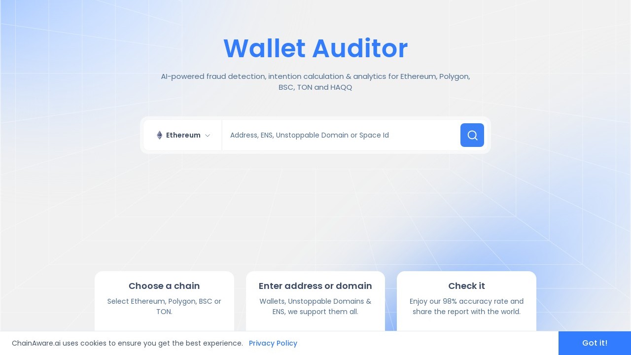 Crypto Wallet Auditor is an AI-driven tool designed to identify fraud in Ethereum, Polygon, and Binance Smart Chain wallets. It offers comprehensive wallet analytics, fraud detection with 98% predictive accuracy, and Web3 user categorization. Additionally, through SmartCredit.io, it provides fixed-term and fixed-interest loans for financial stability.