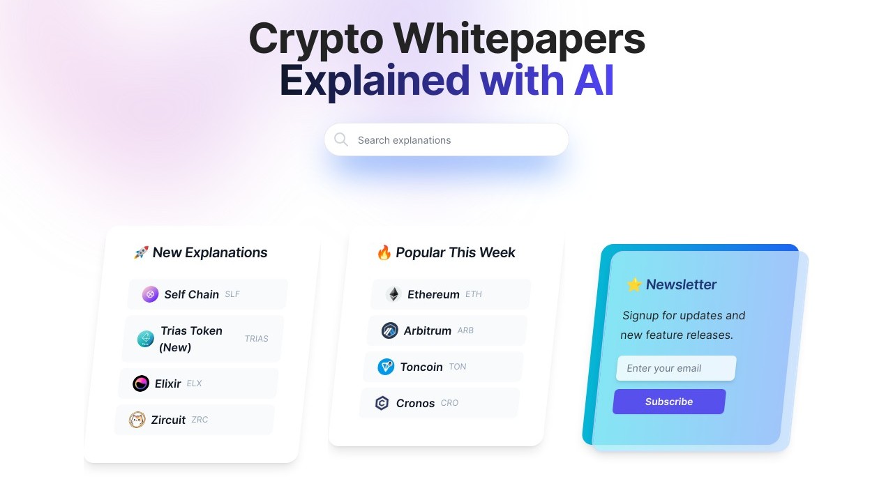 ChainClarity is a tool that utilizes artificial intelligence to break down and clarify cryptocurrency whitepapers, making the intricate and often technical content more approachable for a wider audience. It offers clear and concise summaries, serving as a research aid that helps both beginners and seasoned crypto enthusiasts to better comprehend various crypto projects and their foundational technologies. ChainClarity is useful for those looking to save time, ease the learning curve when entering the cryptocurrency field, and make more informed investment choices without having to sift through the jargon and technical specifics usually present in original whitepapers.