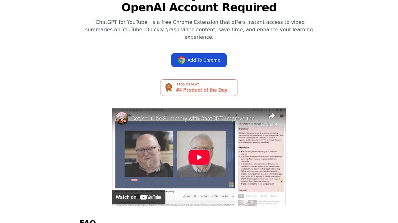 ChatGPT for YouTube is a complimentary Chrome Extension designed to offer users a concise summary of YouTube videos, enabling them to swiftly grasp the video's content and conserve time.