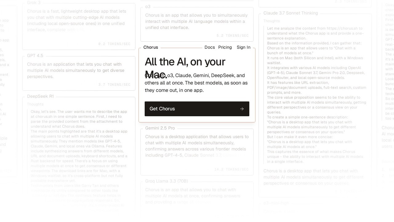 Chorus is a Mac-compatible AI chat app that lets users engage with various AI models at once. It includes advanced models like GPT-4o, Claude Sonnet 3.5, and Gemini Flash, along with local open-source models. The application features synthesis, combining different AI outputs into a unified response for enhanced insights. It also supports URL extraction, document uploads, and full-text searching within chat history. Built on Tauri with a Rust backend, Chorus is optimized for speed and efficiency. Offering seamless model integration and a lightweight interface, it delivers a flexible AI-driven chat experience for diverse applications.