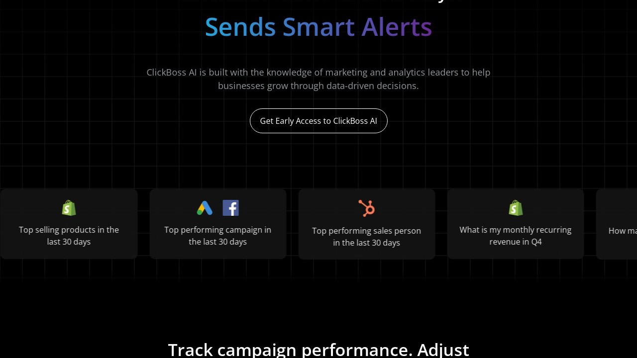 ClickBoss AI is an analytics platform driven by artificial intelligence that converts intricate data into practical insights for enterprises of any size. It provides instant analytics, monitors performance, and delivers intelligent alerts, enabling companies to make informed decisions swiftly and effectively. Users can opt for ClickBoss AI to leverage sophisticated analytics without the need for specialized teams, optimize processes, detect growth potential, and swiftly respond to market changes, thereby enhancing operational efficiency and the allocation of resources.