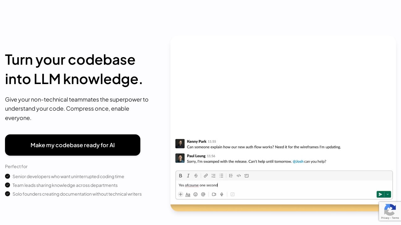Code2.AI is a tool powered by artificial intelligence that converts existing codebases into condensed versions optimized for AI interaction, enhancing the efficiency of code generation and analysis. It is compatible with all programming languages, offers comprehensive project context for AI prompts, and produces complete, working code that integrates smoothly with current projects. Developers can utilize Code2.AI to speed up development, update outdated code, aid in code reviews, or swiftly turn design ideas into functional prototypes, ultimately saving time and enhancing code quality across diverse project types.