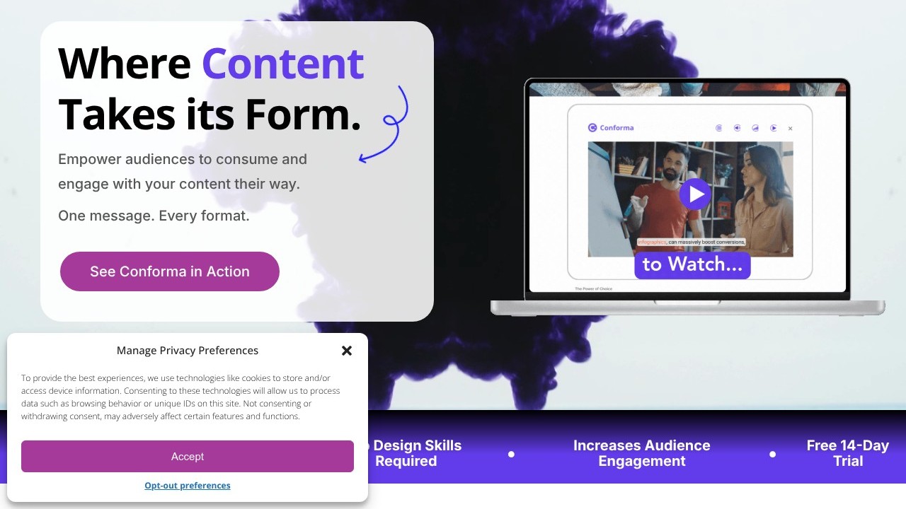 Conforma is a content transformation platform driven by AI that quickly turns plain text into captivating multimedia forms like audio, video, and infographics with little effort. It removes the necessity for expert design skills, making it available to marketers, content creators, and businesses across diverse fields aiming to boost content engagement, enhance accessibility, and lower production expenses. By converting static text into more lively formats, Conforma enables organizations to expand the reach and effectiveness of their content while preserving brand consistency.