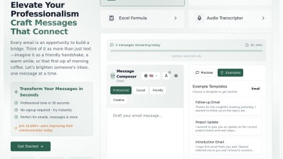 The Professionalize It To Me tool enables users to swiftly create professional emails. It offers 5 complimentary credits daily and has already produced 6,471 messages. Users have the option to duplicate their current message or briefly describe it, choose the type of message, the preferred tone, and the email's language, and then generate their message.