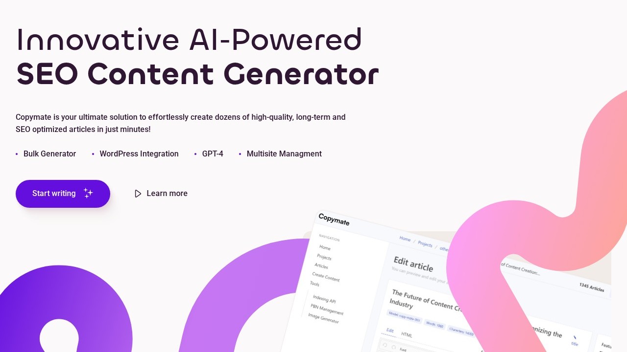 Copymate is an AI-driven SEO content creation tool that enables users to produce numerous high-quality, long-lasting SEO-optimized articles within minutes. It offers features such as Bulk Generator, WordPress Integration, GPT-4, Multisite Management, and SEO Optimization. This tool helps users save time and money while boosting productivity by generating content in any language without requiring familiarity with it.