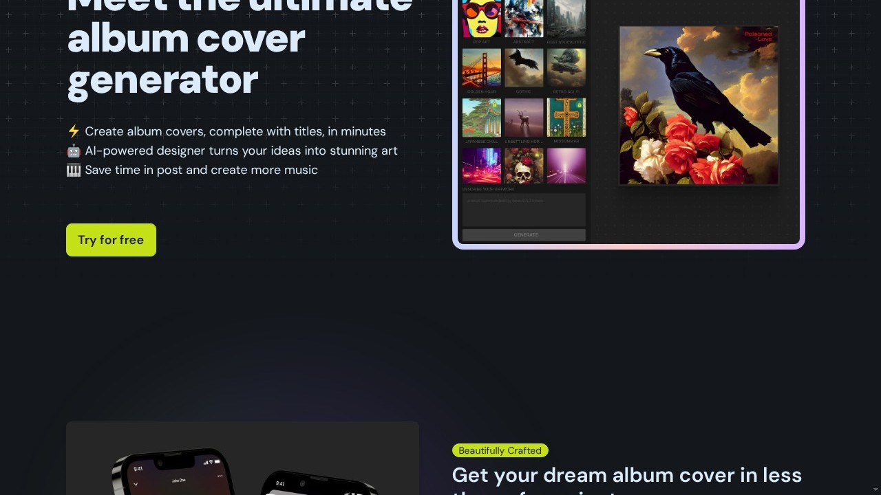 Daft is an AI-driven platform that allows users to design distinctive album covers in just a few minutes. It provides curated aesthetics to help users achieve their preferred vibe and delivers artworks in high-resolution and the appropriate aspect ratio. Additionally, it is compatible with streaming services and social media, with new features being regularly introduced.
