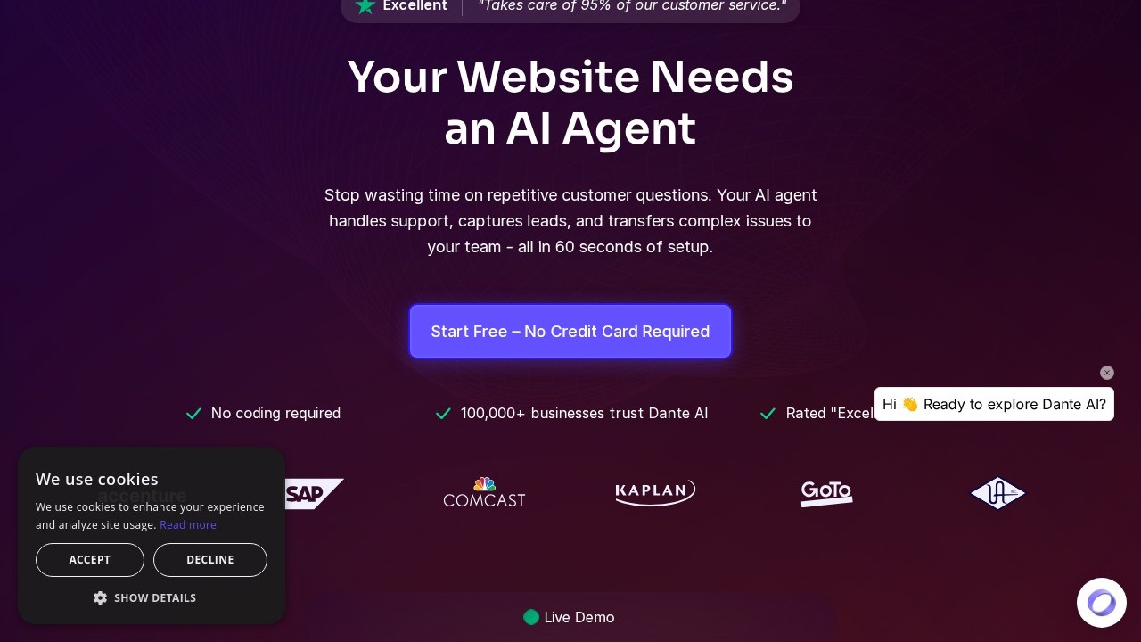 Dante AI is an intuitive platform designed for building custom AI chatbots, avatars, and voice agents without requiring coding skills. It offers businesses the ability to improve customer support, generate leads, and customize interactions in various languages. Users can train AI using their own data, connect with existing systems, and rapidly deploy AI solutions. This tool is perfect for companies of any size aiming to enhance customer interaction, automate support, and integrate AI technology without needing significant technical expertise or resources.