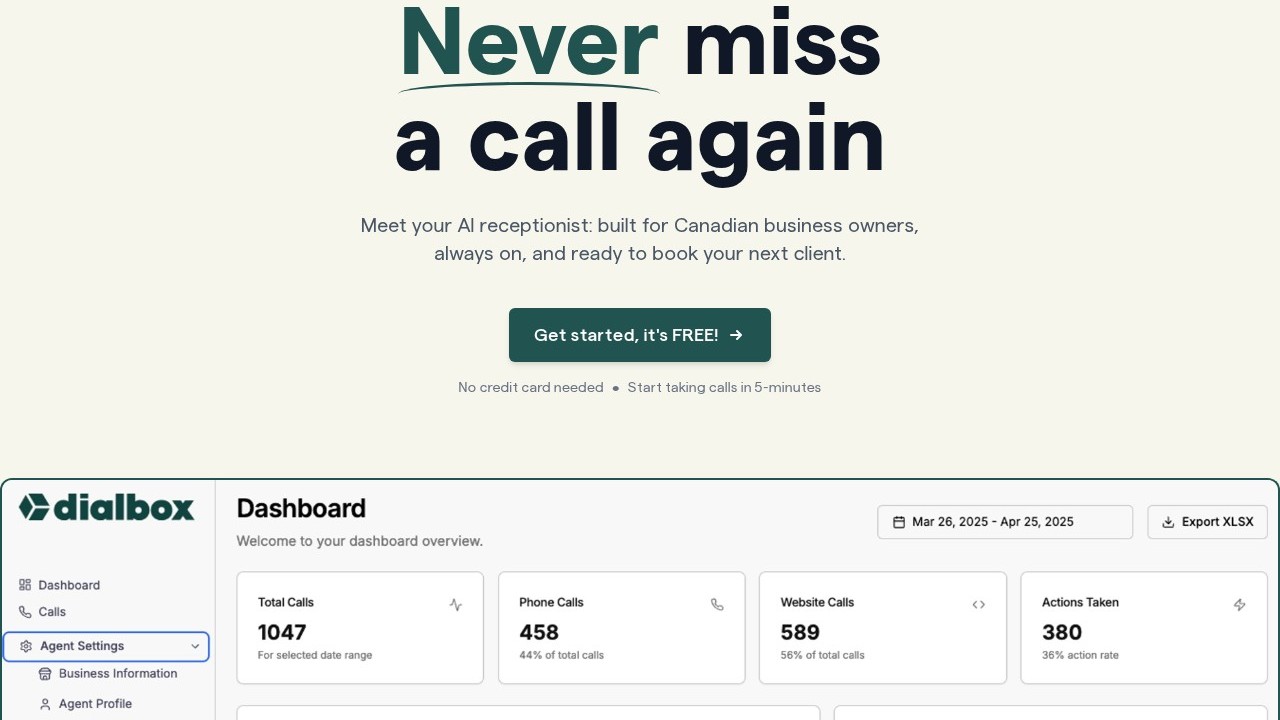 Dialbox is a receptionist platform driven by AI, developed for Canadian companies to make sure every customer call is addressed. It handles calls, records messages, schedules appointments, and assists in turning missed calls into profit. Businesses can quickly set up Dialbox by training the AI, redirecting their phone number, and allowing it to manage calls around the clock. It employs advanced language models to handle inquiries expertly, enhancing customer engagement, boosting lead capture, and cutting down operational expenses. Requiring no credit card and offering a free 25-minute trial, Dialbox delivers a quick, scalable solution for businesses to manage communication effectively and enhance client satisfaction.