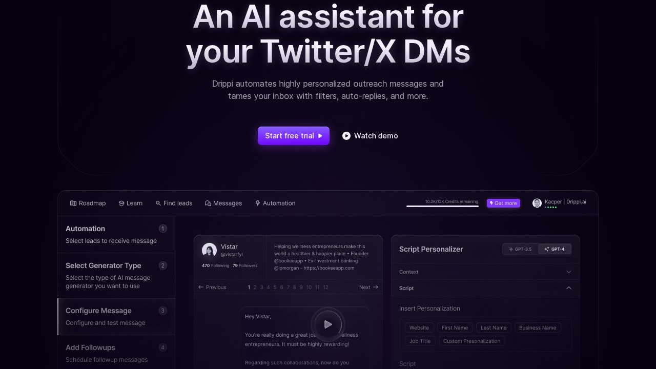 Drippi is an AI assistant designed to automate customized outreach messages via Twitter direct messages, enabling users to conserve time and resources. Drippi's robust lead discovery feature assists users in effortlessly identifying prospects that align with their ideal customer profile. Its AI-driven message generator personalizes messages utilizing Twitter profile details, recent tweets, and website data. Additionally, the tool offers extensive analytics and inbox management features to assist users in monitoring response rates and optimizing communication.