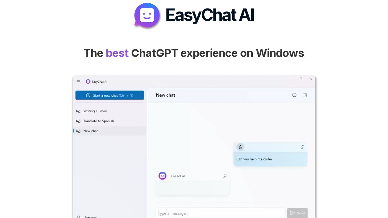 EasyChat AI is a third-party application that enables users to access OpenAI's ChatGPT technology on Windows platforms. Featuring a modern design, Markdown compatibility, and a Dark Mode, it also provides the option to purchase an API key for unlimited requests. It is important to note that EasyChat AI is not connected to OpenAI, and all product names, logos, and trademarks belong to their respective owners.