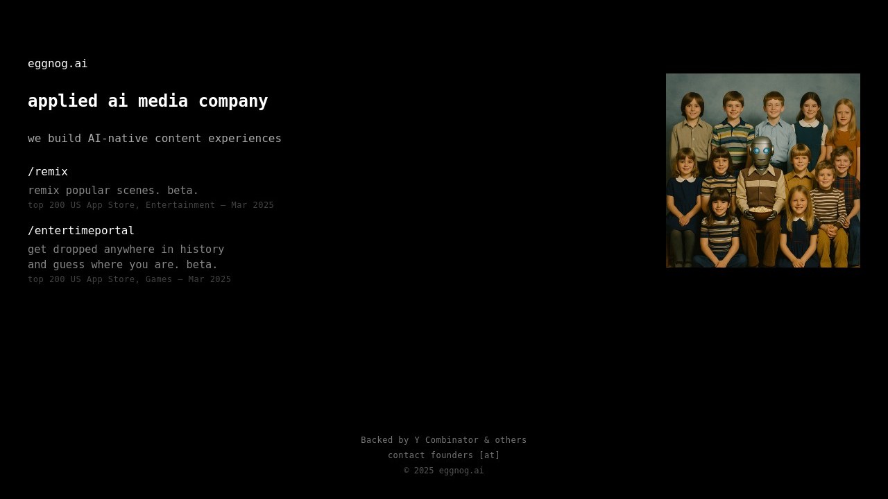 Eggnog is a media company specializing in applied AI that delivers immersive, AI-powered content experiences. Their "remix" app enables users to reinterpret and transform well-known film and TV scenes using generative AI, allowing for innovative, user-created variations of familiar moments. The "entertimeportal" platform transports users to historical settings and tasks them with identifying the era, merging gameplay with educational exploration. Both apps have been ranked in the top 200 in the U.S. App Store—in Entertainment and Games categories respectively—highlighting their popularity and engagement. Supported by Y Combinator and other investors, eggnog.ai blends an analog-meets-AI style with groundbreaking interactivity to revolutionize how audiences connect with media.