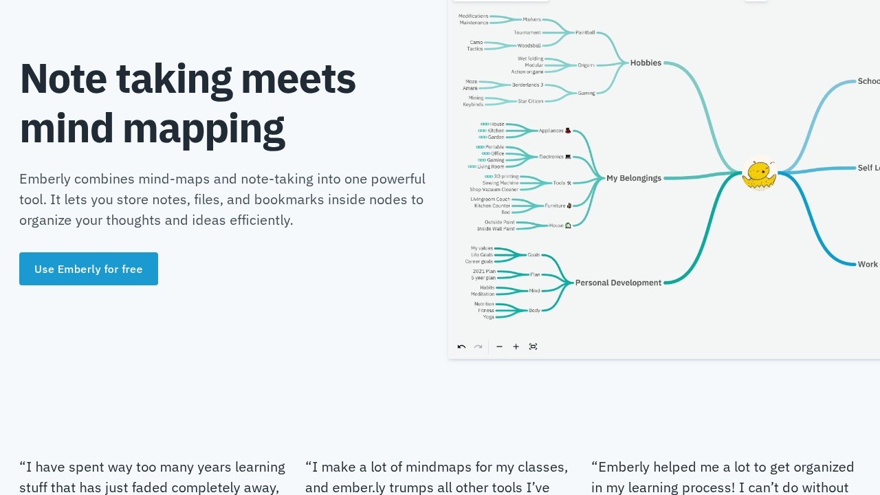 Emberly is a tool for taking notes and creating mind maps that blends organization with creativity. It enables users to store notes, files, and bookmarks within nodes, simplifying the process of organizing thoughts and ideas. With AI-generated mind maps, automated quizzes, an AI writing assistant, and a discussion simulator, Emberly boosts learning and aids in retaining knowledge. It features collaborative editing and serves a variety of purposes. Emberly is designed to maintain organized and lasting knowledge, assisting users in swiftly locating resources and revisiting previous topics. It is a robust tool for both individual and group work.