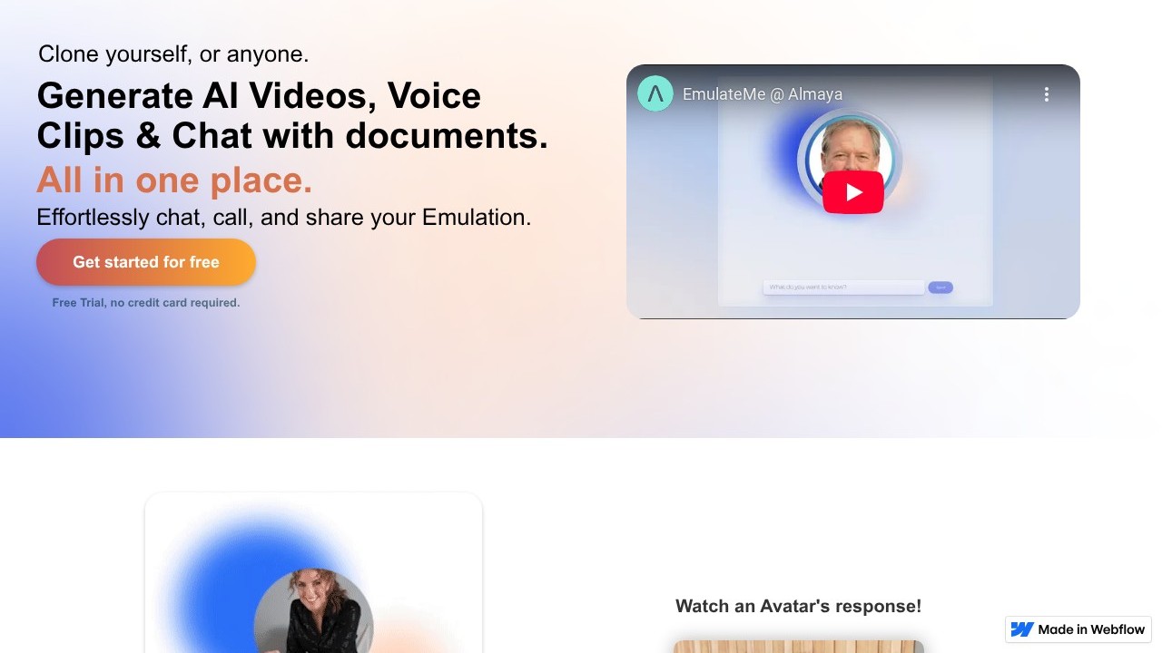 Almaya's Emulate Me is an AI-driven application that enables users to craft a realistic digital representation of themselves or others. By utilizing profile images, voice recordings, and documents, the AI system analyzes the data to produce accurate and dependable responses. Users also receive early access to the tool and a complimentary premium account valued at $100. Additionally, the tool is designed with ethical guidelines to minimize the risk of misuse.