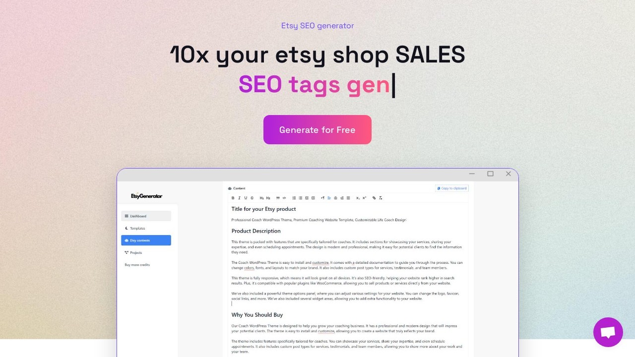 EtsyGenerator is an AI-driven tool intended to help Etsy sellers quickly produce compelling product listings by automatically crafting SEO-optimized titles, descriptions, and tags. By integrating high-search-volume keywords, it not only reduces the time needed to create appealing listings but also aids in boosting search rankings, potentially enhancing visibility and sales. Etsy sellers may find this tool useful for optimizing their content creation, improving their store's SEO, and efficiently expanding their product range without the usual manual labor involved in listing creation.