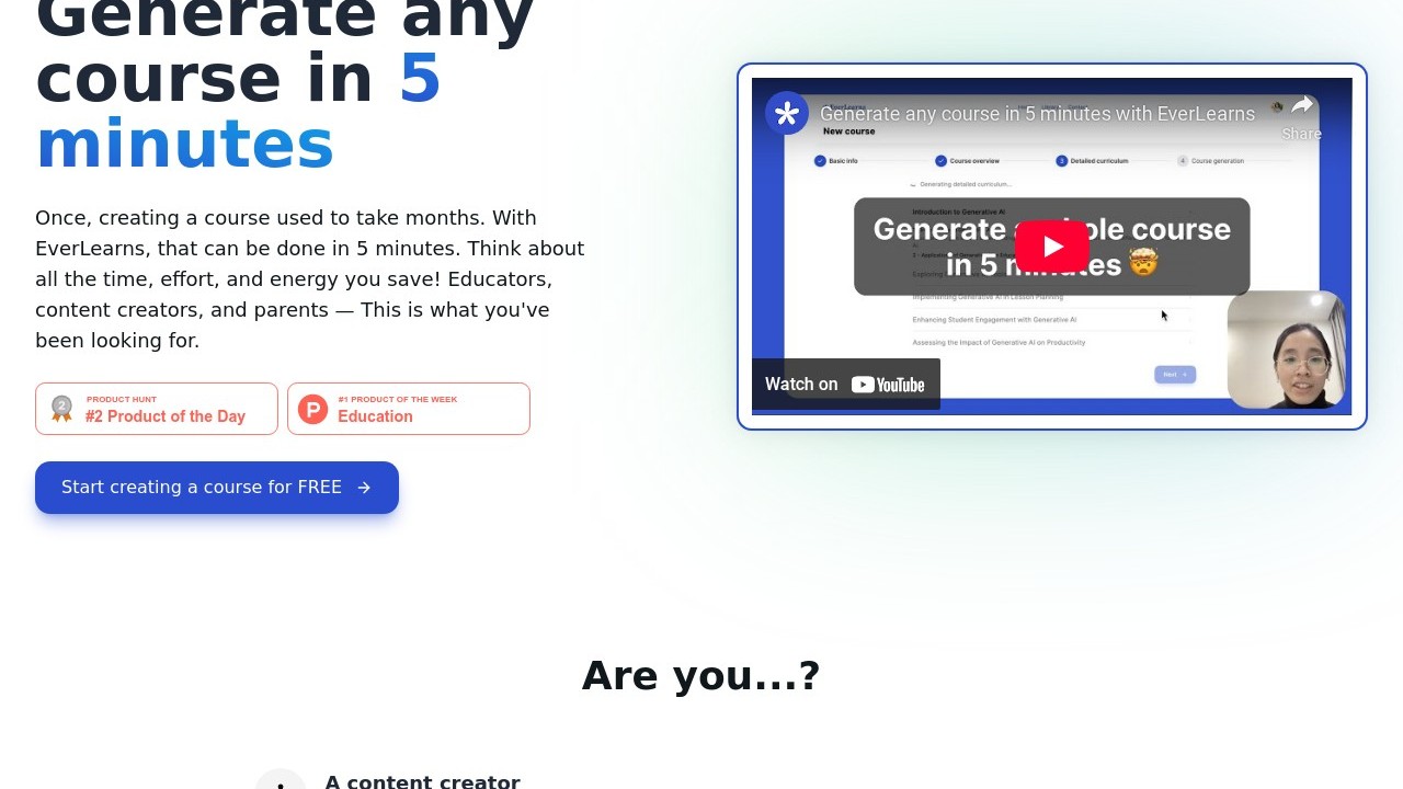EverLearns is an AI-driven course creation tool designed to aid content creators, educators, and parents in rapidly developing educational courses tailored to any subject, audience, and language. Users can convert existing resources, like YouTube videos or lecture recordings, into interactive, high-quality courses complete with auto-generated lessons, quizzes, flashcards, and mind maps. This tool is incredibly useful for those aiming to save time on course development, allowing them to concentrate on delivering engaging content and seamlessly sharing their courses. EverLearns simplifies the course creation process, enabling users to produce a course in just five minutes, which is particularly advantageous for busy individuals seeking efficient and effective methods to educate others or disseminate knowledge.