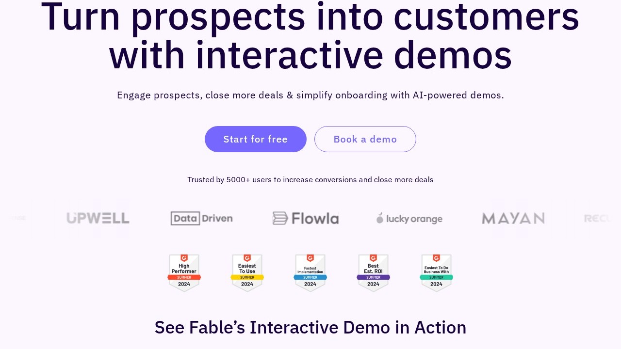 Fable is a platform that allows companies to swiftly and effortlessly develop interactive product demonstrations. It enables users to capture and mimic any web application, tailor the demo using a no-code editor, and distribute it across multiple channels. Marketing, sales, and customer success teams can leverage Fable to highlight their product's value, customize demos for potential clients, and offer interactive guides, resulting in higher conversions, quicker sales cycles, and fewer support inquiries.