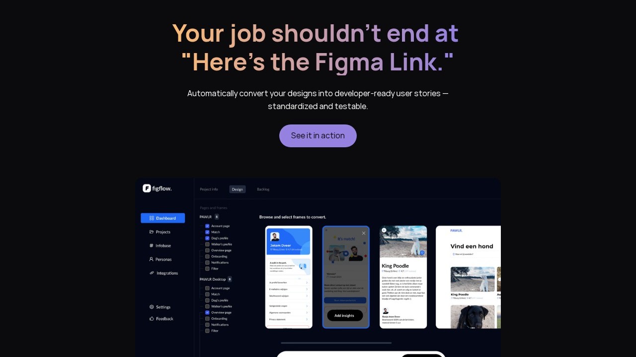 Figflow is an AI-driven tool that simplifies product development processes by transforming Figma designs into user stories, acceptance criteria, and test scripts. It connects with project management systems such as Jira and Trello, aiding collaboration and boosting efficiency. Product teams can utilize Figflow to conserve time, enhance communication between designers and developers, and ensure consistency across the development workflow, thereby accelerating product delivery and minimizing mistakes and miscommunications.