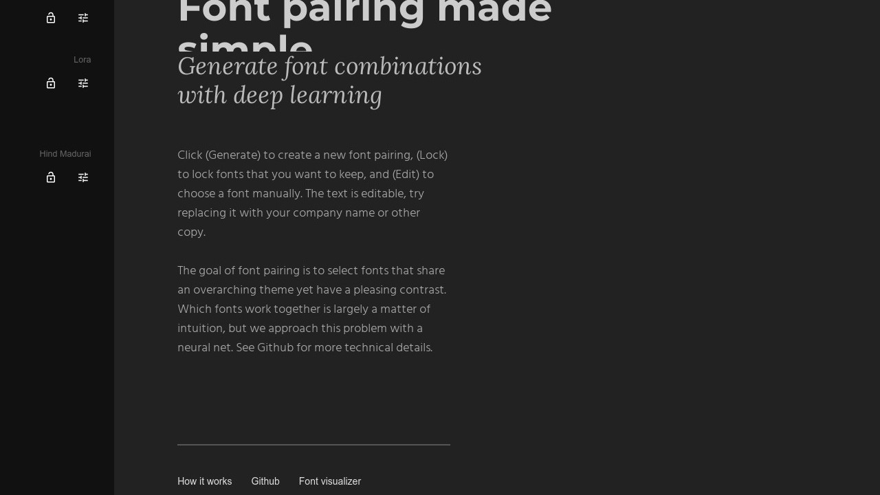 Fontjoy is a tool that streamlines the creation of font pairings through deep learning algorithms. It aids users in generating balanced and visually appealing font combinations with a single click. Users have the option to lock in preferred fonts, make manual adjustments, and edit the sample text. This tool is especially useful for graphic designers, marketers, and anyone working with visual content, as it simplifies the process of selecting complementary fonts, ensuring that typography reflects the intended tone and style of their projects. Fontjoy can be used to save time, maintain design harmony, and enhance the overall aesthetic and readability of digital or print materials.