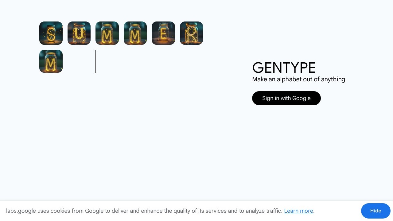 GenType is an AI application that enables users to craft unique alphabets from any idea using Google's Imagen 2. Through a prompt input, individuals can produce all 26 letters with designated foreground, background, and stylistic features. Optimized for contemporary web browsers, it is advised to utilize Chrome for optimal performance. GenType streamlines the creation process by dispatching 26 requests, one per letter, guided by the user's initial input. The created alphabets are temporary and not stored. It seeks to investigate innovative AI applications and might sometimes yield surprising or unsuitable outcomes.