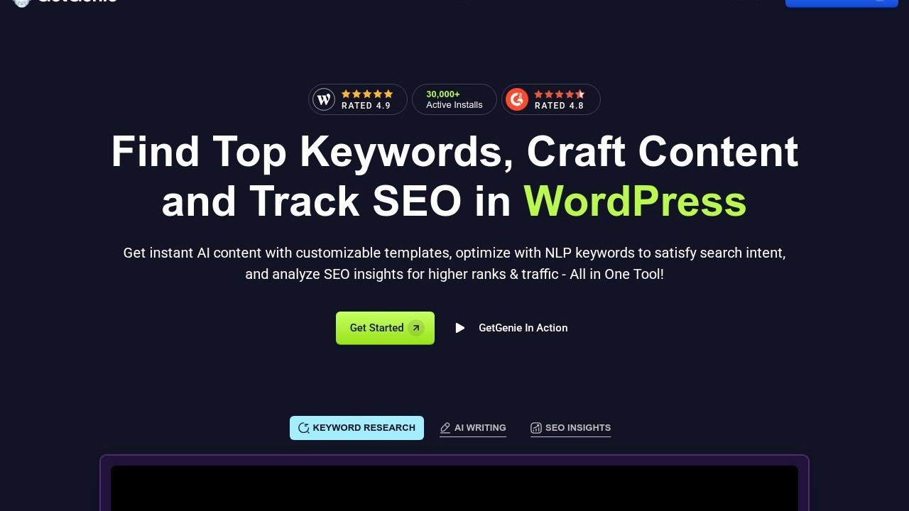 GetGenie is a WordPress plugin driven by AI, offering numerous features to aid content creators and marketers in crafting SEO-friendly content, assessing competitors, and generating new content ideas. By leveraging AI technology, it substitutes over 10 apps and tools, delivering automated content optimization and analysis. The plugin also provides various templates and an AIDA framework for producing impactful content.